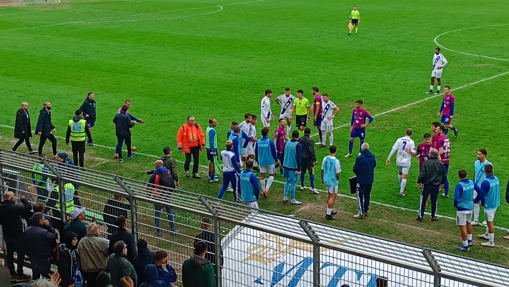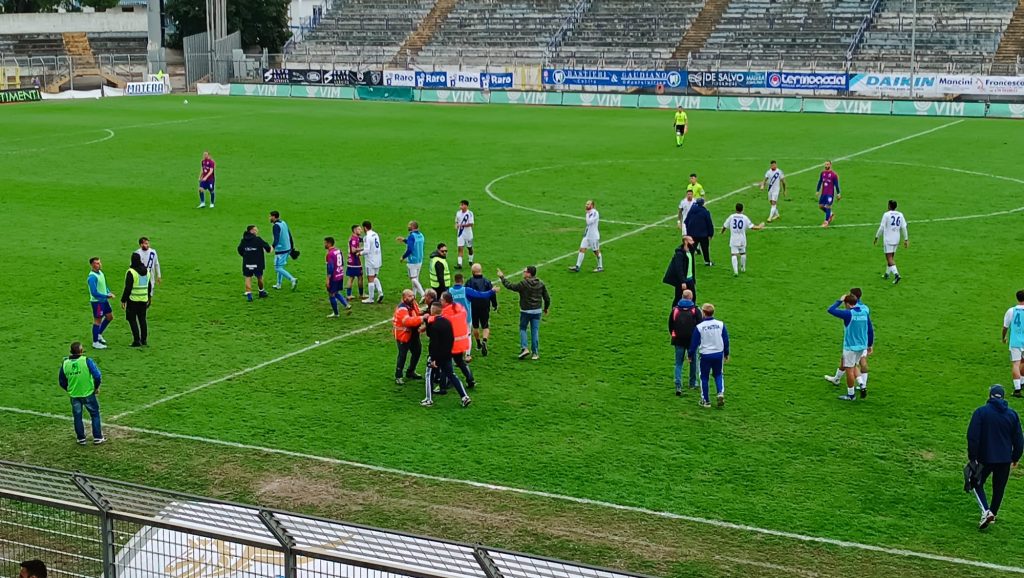 Al 48° arriva il goal della vittoria del Casarano, un ispirato Ganfornina crossa dalla sinistra verso l’area, Saraniti in tuffo e con una vistosa trattenuta anticipa Cipoletta e batte Brahja alla sua destra. La rete viene convalidata che non fa altro che far montare le proteste dei biancazzurri, proteste che portano al secondo giallo del capitano Cipoletta e alla conseguente espulsione. La partita resta ferma per ben 5 minuti con un parapiglia generale tra le due panchine che non se le mando a dire.